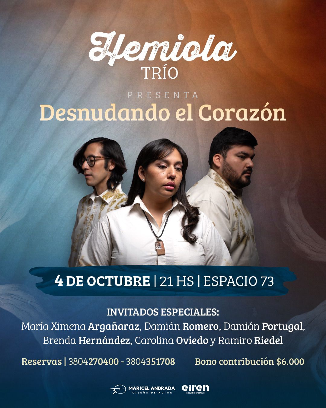 El nombre del trío remite a un recurso rítmico musical, la “hemiola”, concepto que los integrantes adoptaron no solo como técnica sino también como identidad. “Cada uno viene de un lugar distinto, y al juntarnos generamos esa sensación de cambio y de encuentro que representa la hemiola”, explicaron.