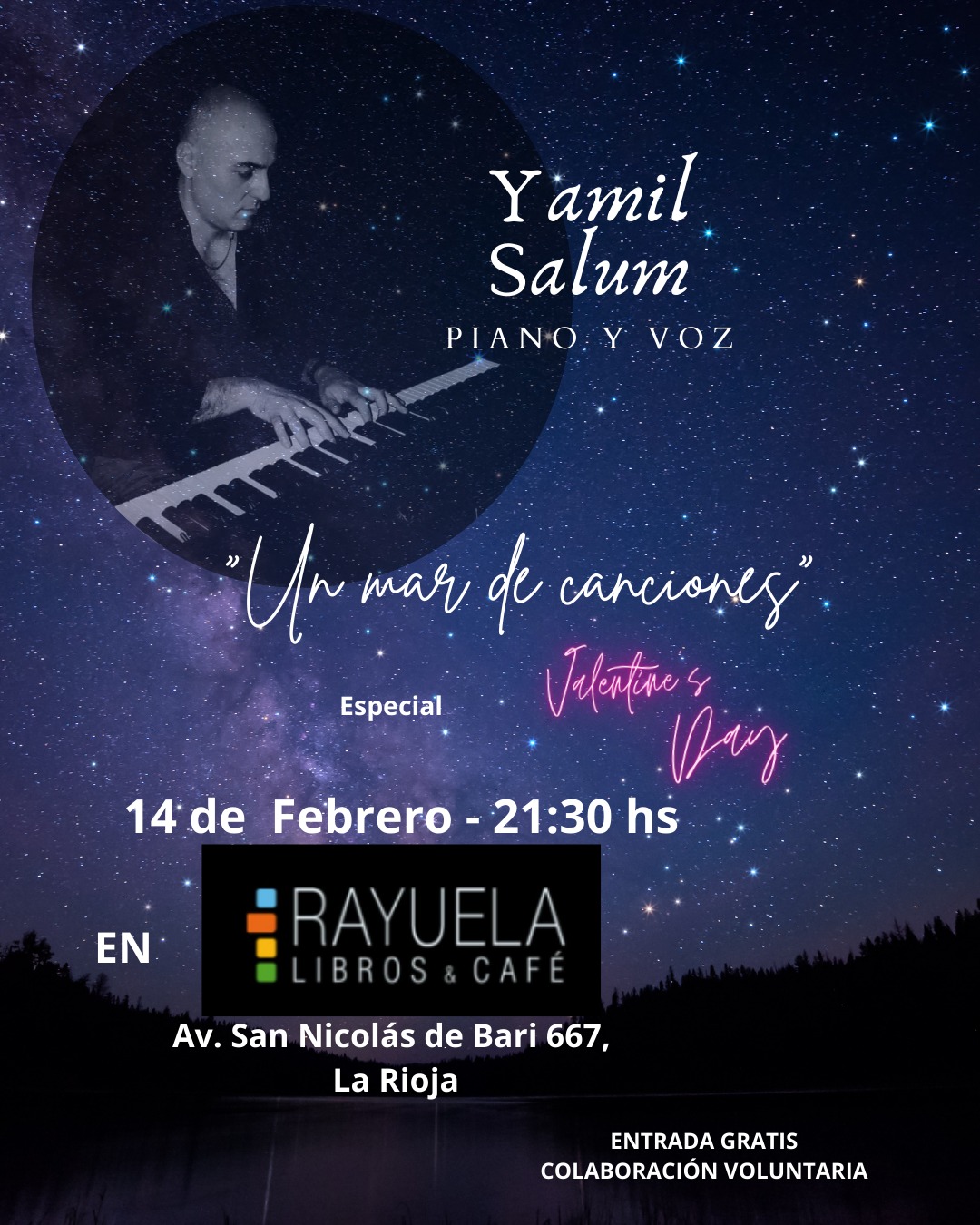 Al cierre, desde las 21.30 hs espectáculo musical a cargo de Yamil Shalum (voz y piano) con una selección destacada de «Un mar de canciones». El show musical es a la gorra.