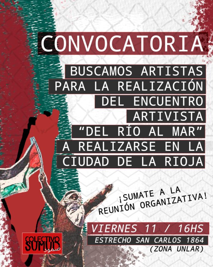 El colectivo Sumud lanzó una convocatoria abierta a artistas riojanos y riojanas para sumarse a la organización del encuentro artivista “Del río al mar”, una propuesta que busca visibilizar desde el arte el reclamo por la causa palestina y denunciar el genocidio en curso en Gaza.