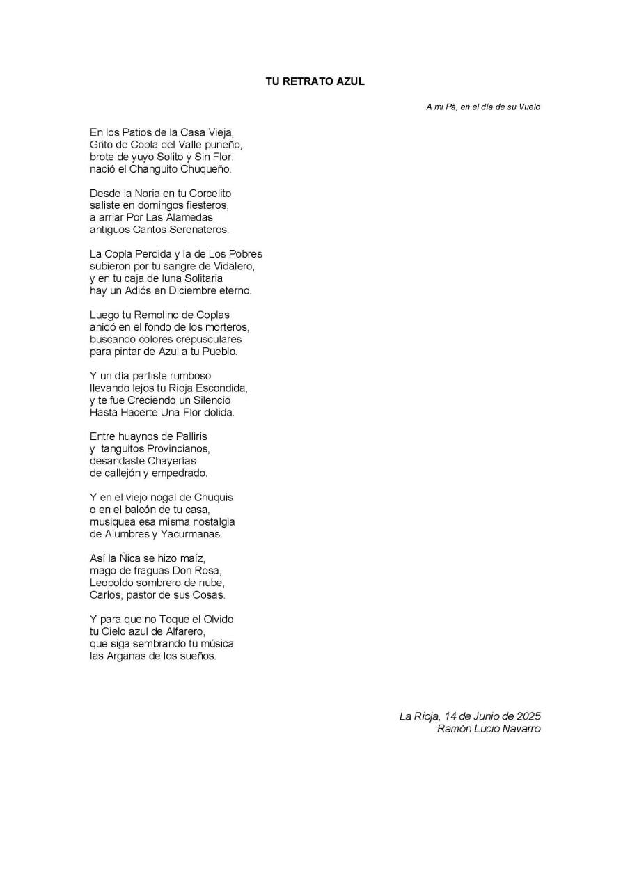 Este sábado 14 de junio se conoció la triste noticia del fallecimiento de Ramón Navarro, el más célebre de los compositores riojanos. Su hijo, Ramón Lucio Navarro, lo despide con un poema y la última canción en la que trabajaron juntos.