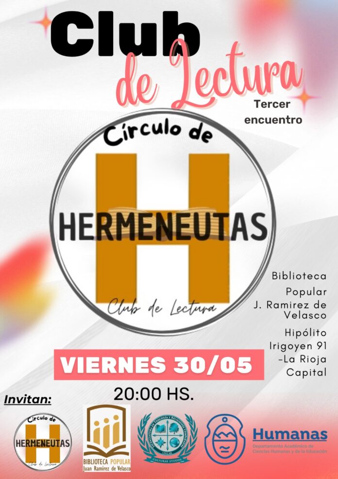 Este viernes 30 de mayo, a las 20 horas, se realizará el tercer encuentro del Club de Lectura «Círculo de Hermeneutas» en la Biblioteca Popular Juan Ramírez de Velasco, ubicada en Hipólito Yrigoyen 91.