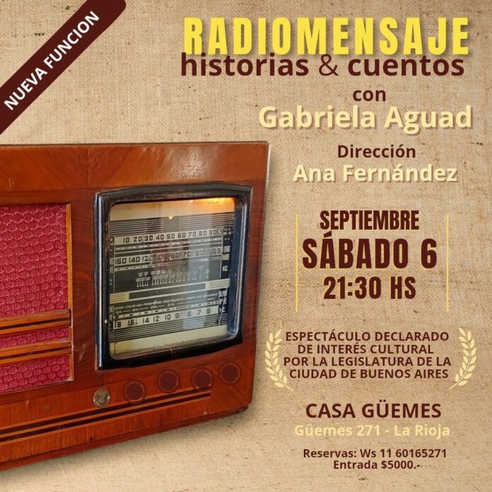 La obra unipersonal Radiomensaje (historias & cuentos), protagonizada por Gabriela Aguad y con dirección de Ana Fernández, se presentará el sábado 6 de septiembre a las 21.30 en Casa Güemes, Güemes 271, La Rioja.