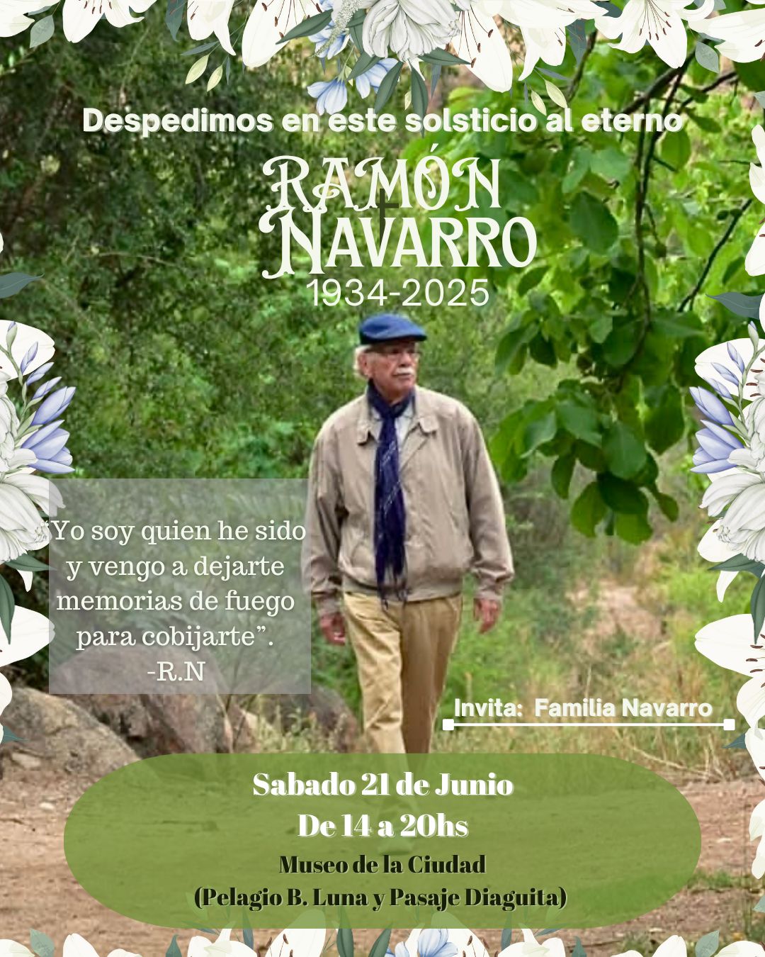 InicioDestacadosInvitan a la despedida a Ramón Navarro Related Posts Música Cimbra presentó su nuevo videoclip Cultura - Leer más Teatro «Espacios en disputa»: ciclo de creación de experiencias teatrales y performáticas Cultura - Leer más Pintura Inaugurarán la muestra «De Memorias y de Vuelos» Cultura - Leer más Destacados Los Larras se presentan en vivo Cultura - Leer más Destacados Sábado de rock en Don Mario Bar Cultura - Leer más Invitan a la despedida a Ramón Navarro FacebookTwitterPinterestWhatsApp Despedimos en este Solsticio al Eterno Ramón Navarro Sábado 21 de Junio de 14 a 20hs Museo de la Cuidad Pelagio B.Luna y Pje. Diaguita «Yo soy quien he sido, y vengo a dejarte memorias de fuego para cobijarte» Ramon Navarro Artículo anteriorTrabajadores independientes de la escena: se viene una nueva jornada de debate y reflexiónArtículo siguiente«Semilla Cantora» vive su tercera luna DEJA UNA RESPUESTA Cancelar respuesta Comentario: Por favor ingrese su comentario! Nombre:* Por favor ingrese su nombre aquí Correo electrónico:* ¡Has introducido una dirección de correo electrónico incorrecta! Por favor ingrese su dirección de correo electrónico aquí Sitio web: Guardar mi nombre, correo electrónico y sitio web en este navegador la próxima vez que comente. Δ Cultura FacebookInstagramTwitterYoutube Latest Posts Música Cimbra presentó su nuevo videoclip Cultura - 18 abril, 2026 Leer más Teatro «Espacios en disputa»: ciclo de creación de experiencias teatrales y performáticas Cultura - 18 abril, 2026 Leer más Pintura Inaugurarán la muestra «De Memorias y de Vuelos» Cultura - 17 abril, 2026 Leer más