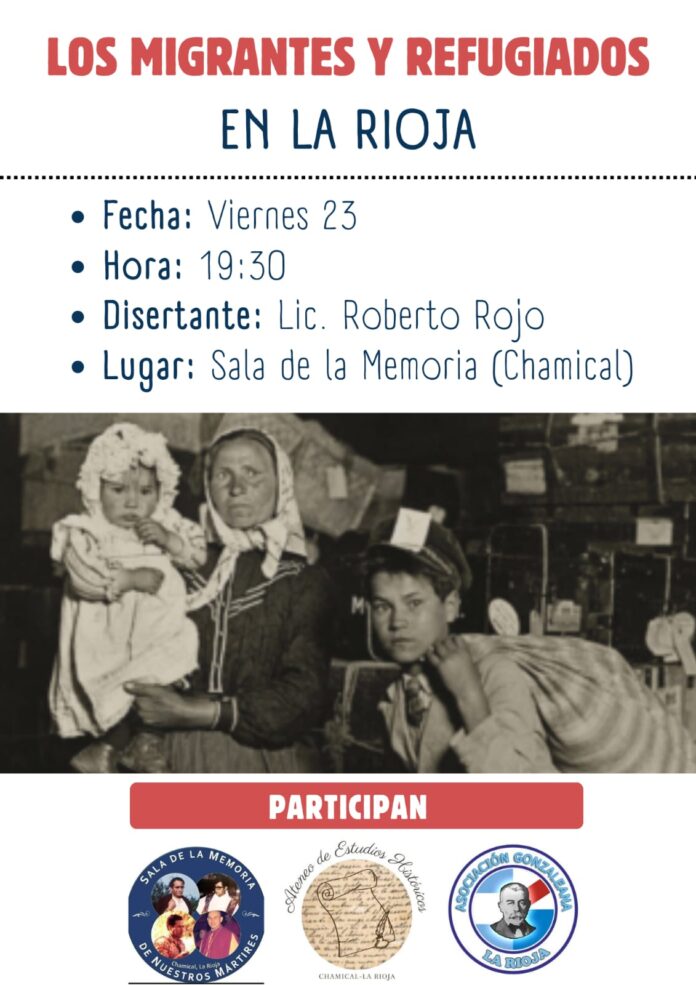 Este viernes 23 de mayo a las 19:30 horas, en la Sala de la Memoria de Nuestros Mártires de Chamical se presentará el conversatorio «Los migrantes y refugiados en La Rioja» a cargo del Lic. Roberto Rojo de la Asociación Gonzaleana. Autor del libro «Sociedad Sirio Libanesa de La Rioja 1910 – 2018».