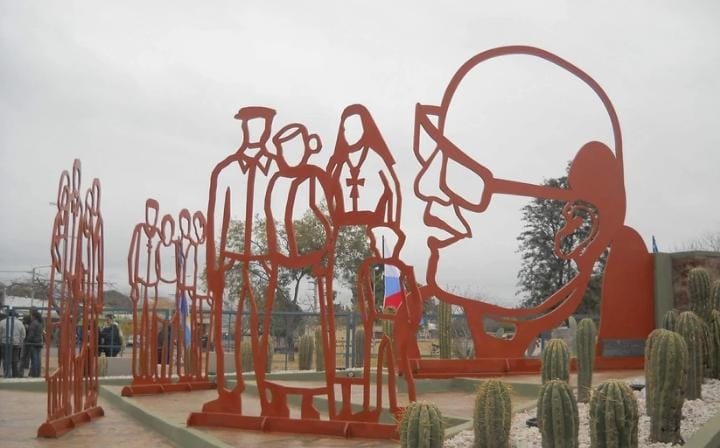 La Rioja tiene un cura mártir, que hace un par de años fue nombrado beato y cuya imagen también es parte del catálogo artístico de Rodríguez. «Otro momento muy importante y muy gratificante para mí fue cuando me convocaron para presentar un proyecto en espacio público sobre el obispo Enrique Angelelli, que tuve la fortuna de que después se realizara; es la obra que está ubicada en la exavenida Córdoba (actual avenida Enrique Angelelli). La realicé en 2010, en conmemoración del Bicentenario. La Rioja tomó el tema de Derechos Humanos. Creo que el espacio público es el ámbito ideal, porque la obra entra en contacto con la comunidad, pasa a ser un equipamiento urbano y se desdibuja su autoría. Esa obra fue muy importante por el motivo, la figura de Enrique Angelelli a quien admiro por toda la obra que realizó en La Rioja y fue muy significativa para mí por el tamaño y por la envergadura».