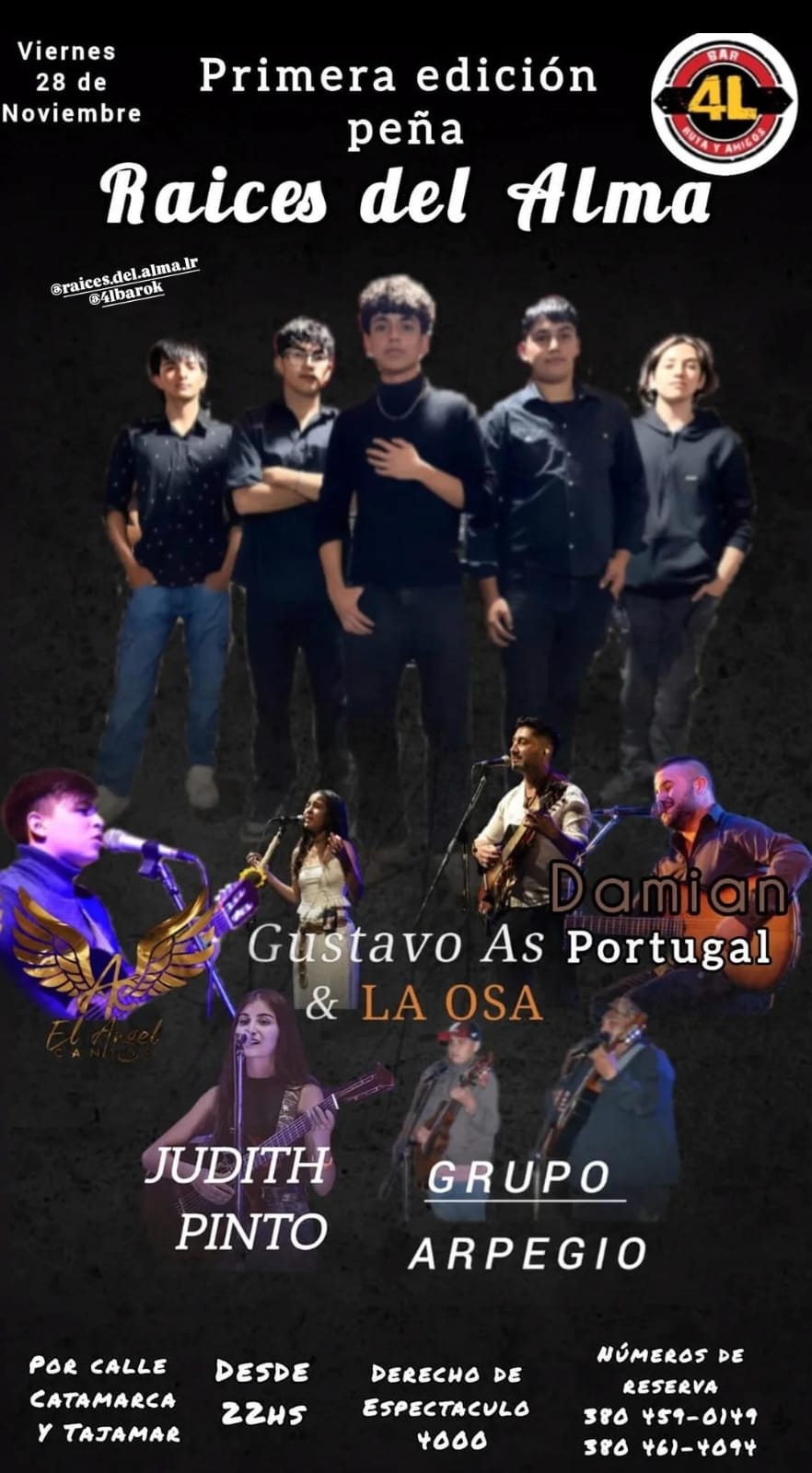 Se viene una noche de música y tradición con la primera edición de la peña Raíces del Alma, que tendrá lugar el viernes 28 de noviembre en el bar 4L. El encuentro reunirá a artistas locales en un espacio pensado para celebrar el folclore y la identidad cultural riojana.