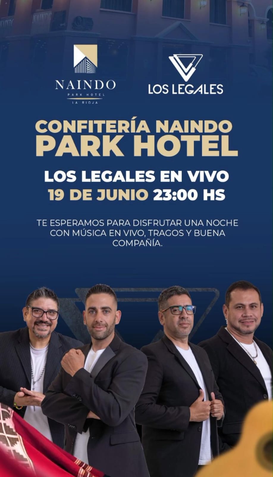 El próximo jueves 19 de junio a las 23:00 horas, la reconocida banda Los Legales brindará un show en vivo en la confitería del Naindo Park Hotel, una de las locaciones más elegidas de la Capital para disfrutar de la noche.