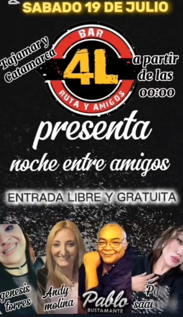 Este sábado 19 de julio, el Bar 4L, ubicado en la esquina de Tajamar y Catamarca, será escenario de una velada especial bajo el nombre “Noche entre Amigos”.