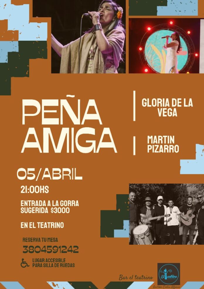 Este sábado 5 de abril a las 21:00 horas, El Teatrino se viste de fiesta para recibir a «Peña Amiga», un evento que promete una noche de música, cultura y encuentro. Con una modalidad de entrada a la gorra sugerida en $3.000, la jornada invita a disfrutar de grandes artistas en un ambiente cálido y acogedor.