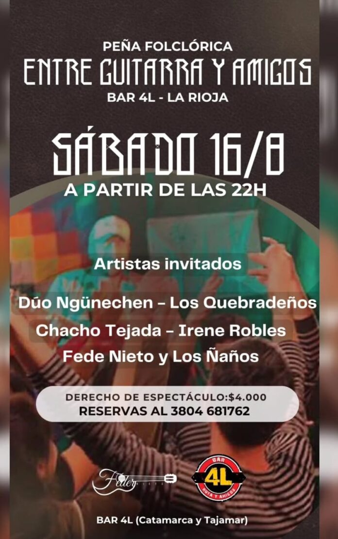 Este sábado 16 de agosto a partir de las 22, el bar 4L de La Rioja será sede de la peña folclórica “Entre Guitarra y Amigos”.