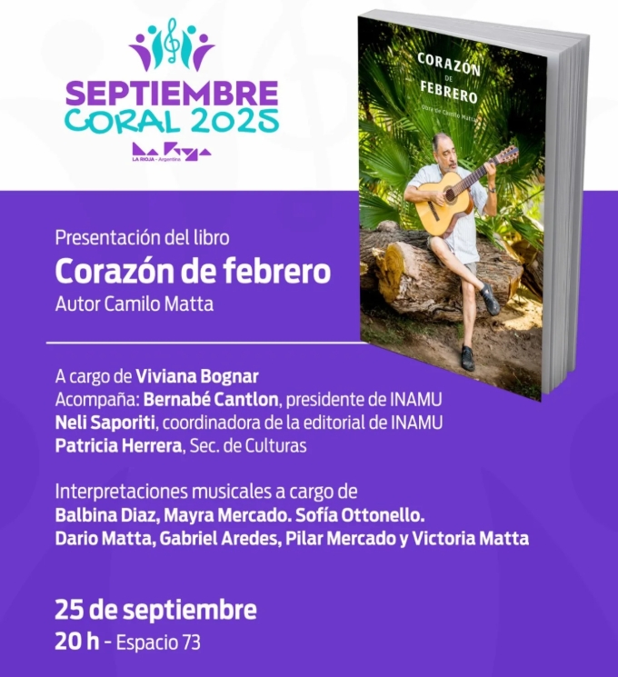 En el marco de la primera edición del Septiembre Coral La Rioja 2025, este jueves se presentará el libro “Corazón de febrero”, del músico y compositor Camilo Matta. La actividad tendrá lugar a las 20 en Espacio 73.