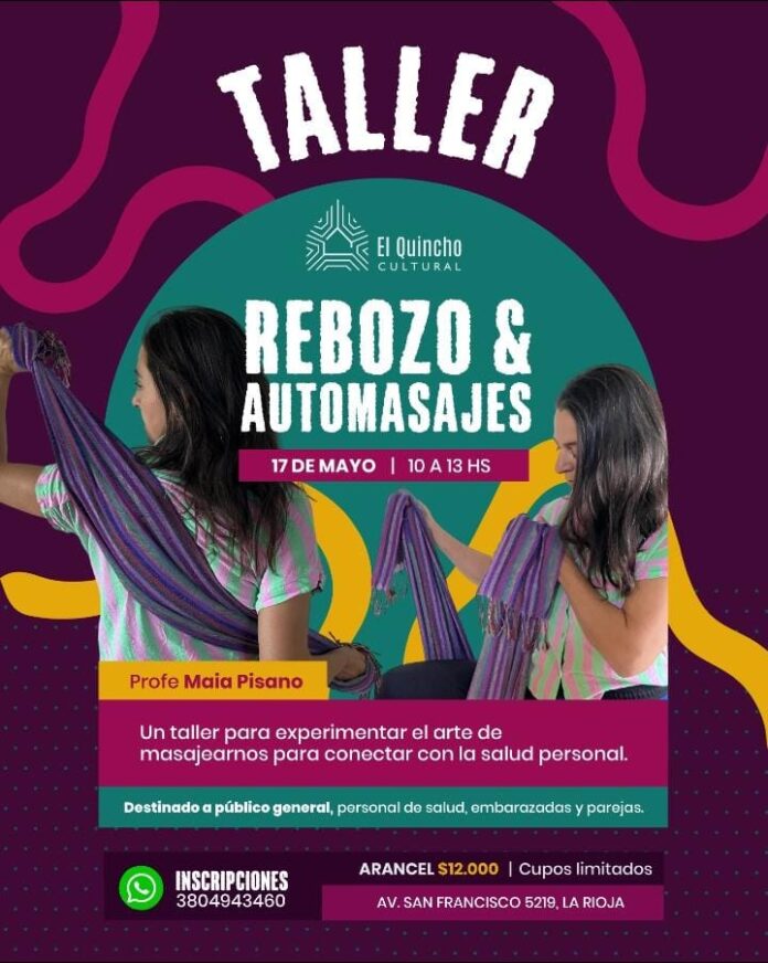 El sábado 17 de mayo, de 10 a 13 horas, se llevará a cabo en El Quincho Cultural (Av. San Francisco 5219, La Rioja) un taller destinado a explorar el arte del automasaje y la técnica del rebozo, una herramienta ancestral de origen mexicano que ha sido utilizada en distintas culturas del mundo.