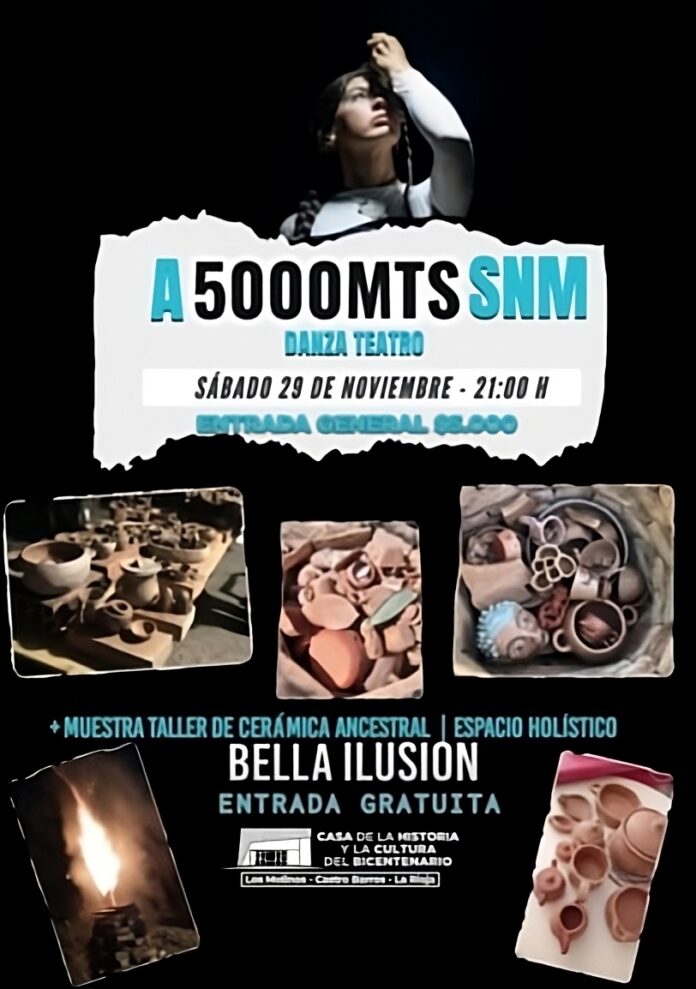 La Casa de la Historia y la Cultura del Bicentenario de Los Molinos será este sábado 28 de noviembre el punto de encuentro para una doble propuesta artística: la Muestra de Cerámica Ancestral Bella Ilusión y la obra de teatro–danza A 5000 mts snm, creada por Mora Galleguillo Navarro.