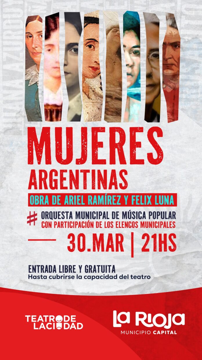 En el marco del mes de la mujer, desde la Subsecretaria de Cultura Municipal, se realizará el concierto “Mujeres Argentinas”, a cargo de la Orquesta de Música Popular con la participación especial de la cantante Balbina Diaz y elencos municipales.