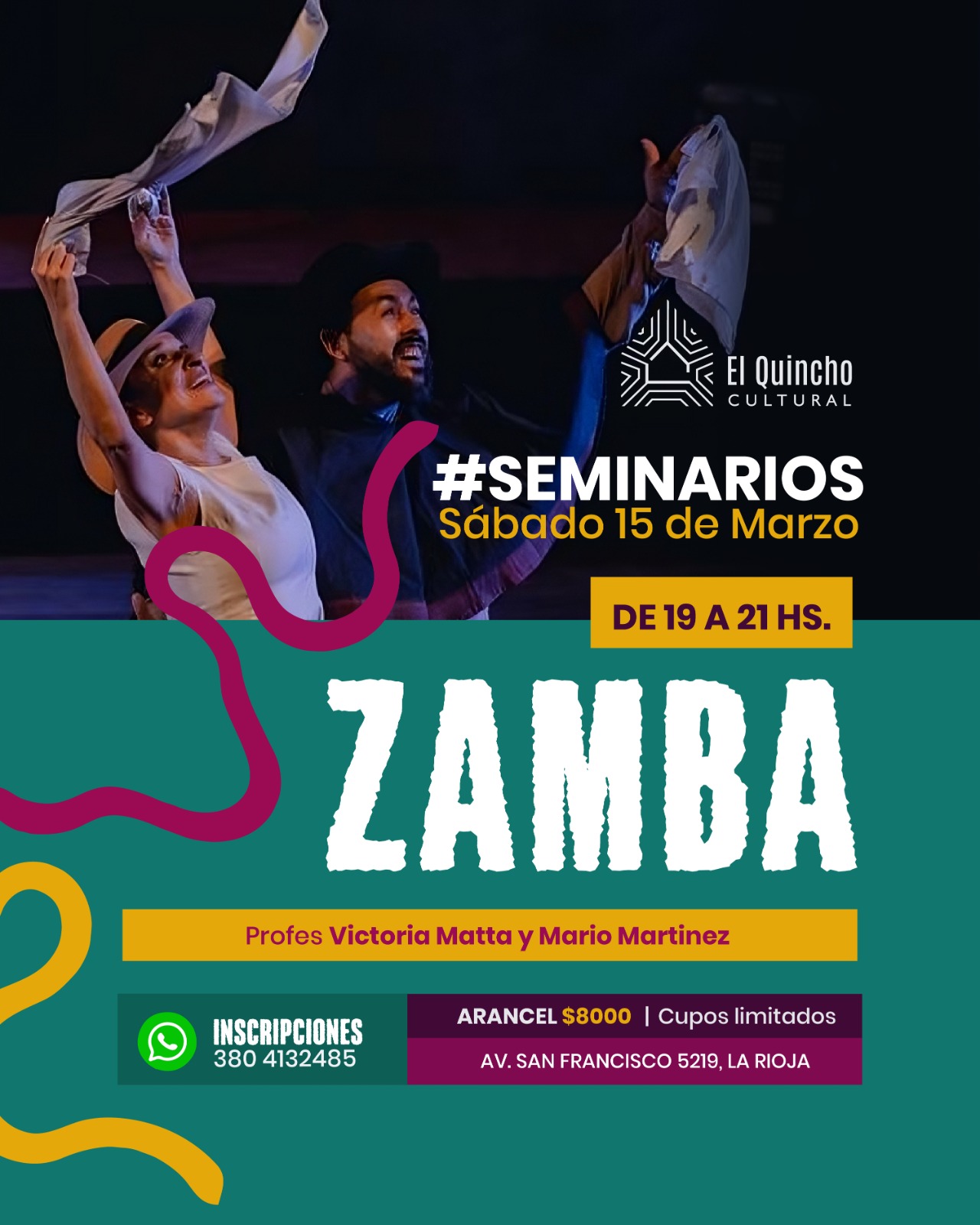 El segundo, de 19 a 21 hs., será sobre zamba, con las clases dirigidas por Victoria Matta y Mario Martínez.