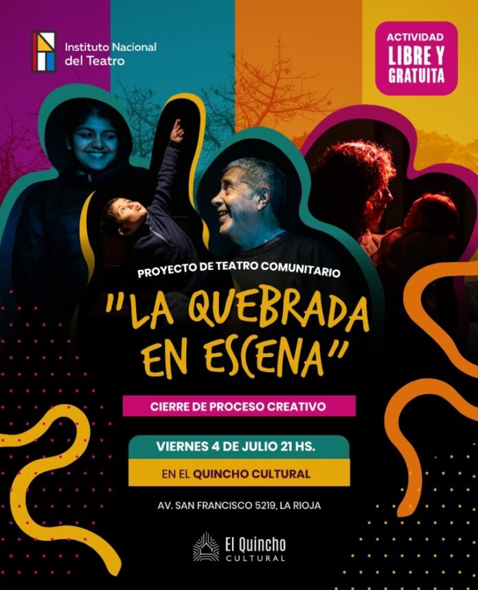 El próximo viernes 4 de julio, a las 21 horas, se realizará el cierre del proceso creativo del proyecto de teatro comunitario «La Quebrada en Escena». La actividad tendrá lugar en El Quincho Cultural, ubicado en avenida San Francisco 5219, con entrada libre y gratuita.